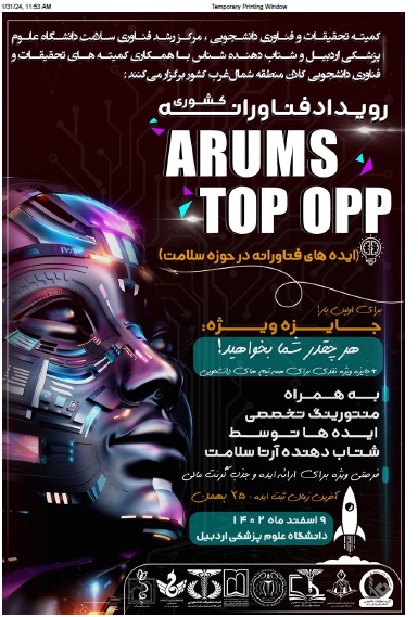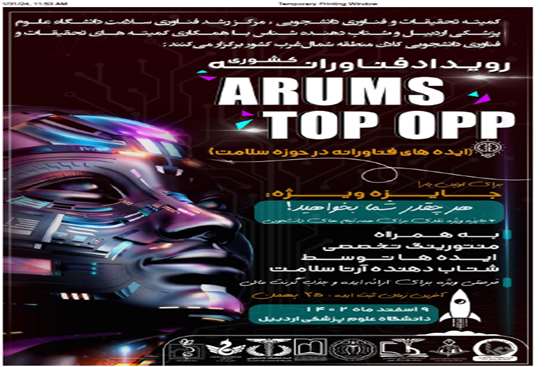 کمیته تحقیقات و فناوری دانشجویی و مرکز رشد فناوری سلامت دانشگاه علوم پزشکی اردبیل در نظر دارد رویداد فناوری های نوین سلامت  (ARUMS TOP OPP) در سطح کشوری در تاریخ 9 اسفند سال جاری برگزار نماید.